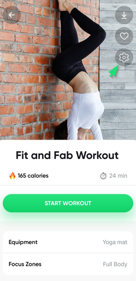 Before starting the workout, locate and tap on the gear icon (⚙️), which represents the settings menu.