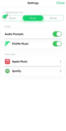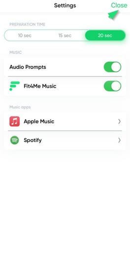Once you’ve selected your preferred preparation time, tap the “Close” button to exit the settings menu. You’re now ready to start your workout with the adjusted preparation time!