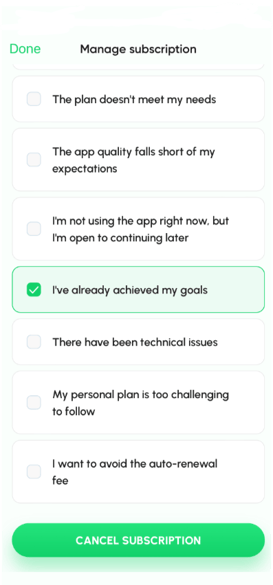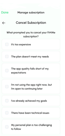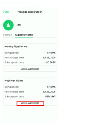 Please note that cancelling the meal plan does not affect your main subscription-you can continue your fitness journey with all the core features of the app.