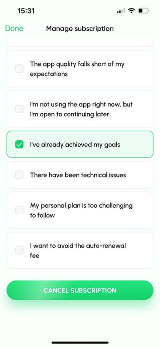 4. Here, you can view your subscription details or cancel it by tapping "Cancel Subscription" and selecting a cancellation reason.